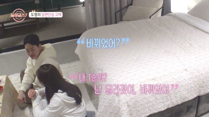 밤이 깊어지자, “심야 사랑방이 열렸다”라는 공지가 기습 오픈됐다. ‘비밀도장 데이트’를 못 나갔던 도형은 첫 타자로 나서 “수달 나와!”라고 명은을 향해 외쳤다. 두 사람은 처음으로 오픈된 ‘사랑방’에 입장했고, 둘만의 대화에서 도형은 “그동안 네게 확실히 호감을 표현하지 못해서 아쉬웠다”라며 “오늘 너한테 선택받지 못한다면, 아무한테도 선택받지 않는 게 낫다고 생각했다. 내일 나와 1:1 데이트 하자”라고 대시했다. 명은은 “나도 그러고 싶었어”라며 흔쾌히 데이트를 수락했다.