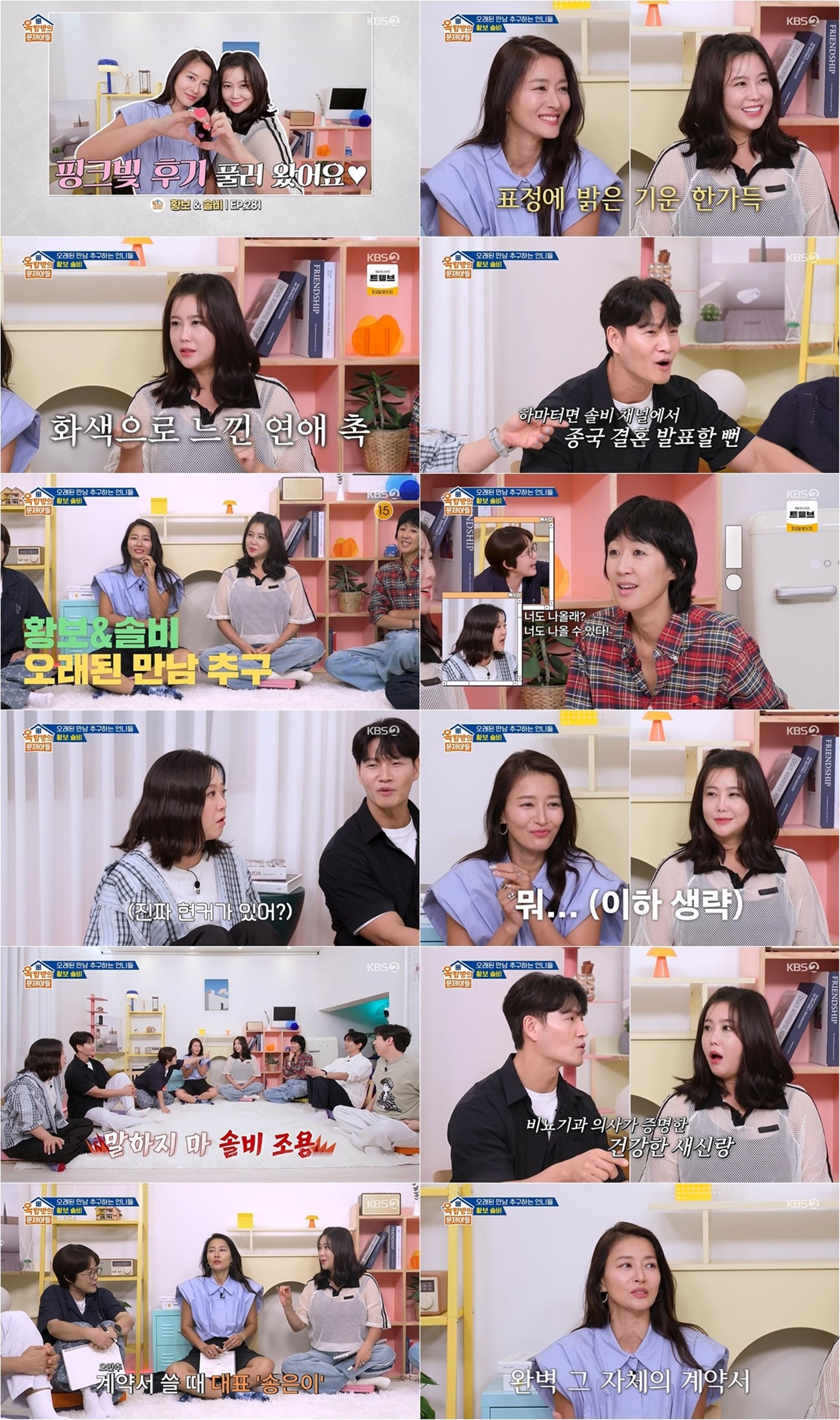 28일 방송된 KBS 2TV ‘옥탑방의 문제아들 시즌2’(약칭 ‘옥문아’) 281회는 예능 ‘오래된 만남 추구’(약칭 ‘오만추‘) 3기에서 활약하는 황보와 솔비가 옥탑방에 초대돼 송은이, 김숙, 김종국, 홍진경, 양세찬, 주우재와 함께 기상천외한 문제들을 두고 도파민 터지는 퀴즈 전쟁을 펼치는 모습이 담겼다.