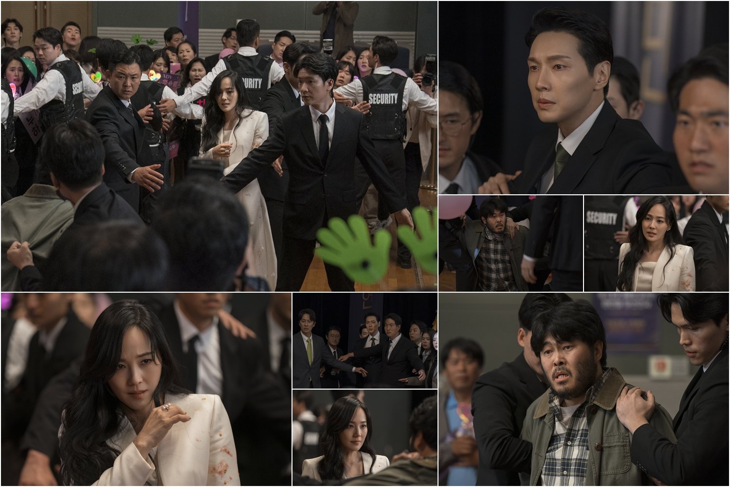 그런가 하면 유진과 지현우, 김기방은 ‘대혼란 토마토 테러’ 장면에서 폭발적인 연기 에너지를 뿜어내 현장을 휘감았다. 유진은 새하얀 정장이 토마토의 핏빛으로 물드는 극한의 상황에도 불구하고 흔들림 없이 의연하게 대처하는 카리스마를 구현했다. 지현우는 친구 윤기주의 돌발 행동에 혼란스러워하면서도 묵직한 무게감을 빛내는 현민철의 모습으로 리얼리티를 배가시켰다. 김기방은 분노의 화신처럼 타오르는 광기를 표출하며 강력한 변수로 맹활약해 앞으로의 서사에 대한 집중력을 높였다.