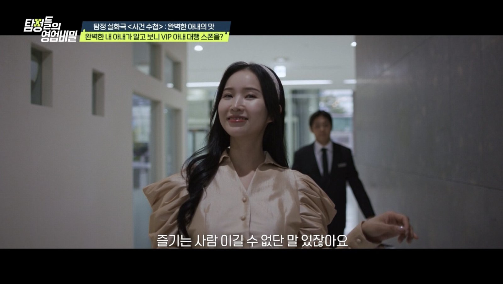 수일 후 아내의 수상한 행적을 포착한 의뢰인은 다시 탐정단을 찾았다. 의뢰인 아내의 출장길을 추적한 탐정단은 그녀가 청담동의 한 숍에서 머리부터 발끝까지 꾸미고 나온 뒤, 한 중년 남성에게 “여보”라고 부르며 그의 집으로 들어가는 충격적인 장면을 목격했다.