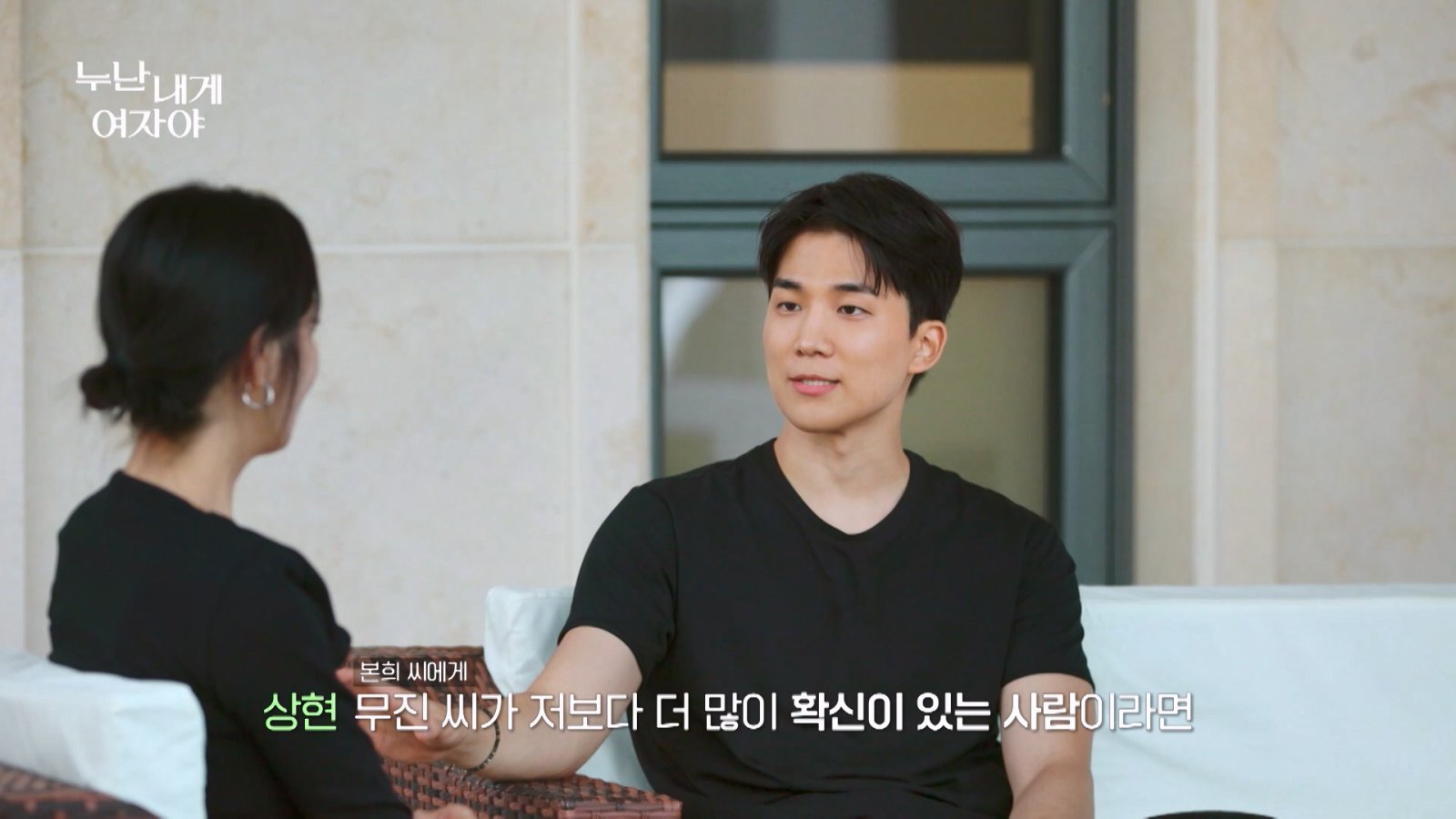 1일 방송된 ‘누난 내게 여자야’에서는 김상현이 본격적으로 움직이기 시작했다. 상현은 구본희에게 호감이 있었지만 이야기를 나눌 기회가 없어 초조해했다. 이에 상현은 본희와 첫 데이트부터 함께하며 ‘쌍방 호감’을 확인한 무진에게 둘만의 대화를 요청했다. 그는 “처음부터 본희 씨를 좋게 생각했는데, 항상 본희 씨 옆에 계시는 게 보였다. 저도 본희 씨와 이야기 한번 하고 싶다”라며 본희를 만나러 갈 것을 예고했다. 무진은 “끌리는 대로, 하고 싶은 대로 하려고 연하우스 온 것 아니냐. 전혀 신경 안 써도 된다”라며 대화를 마쳤지만, 본희와 대화하러 간 상현이 신경 쓰이는 모습이었다.