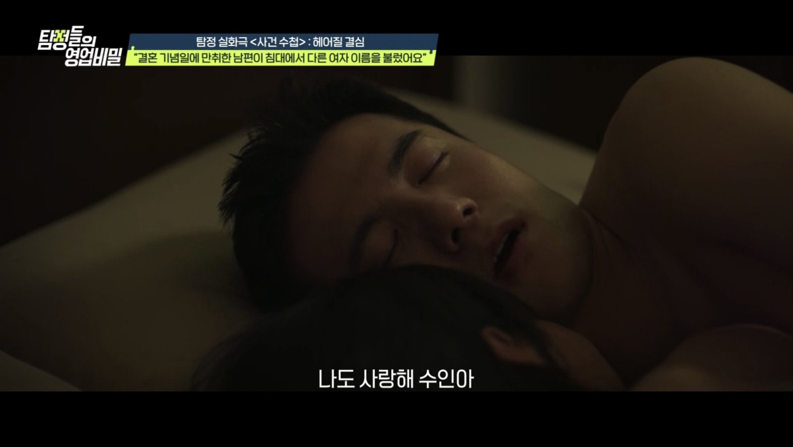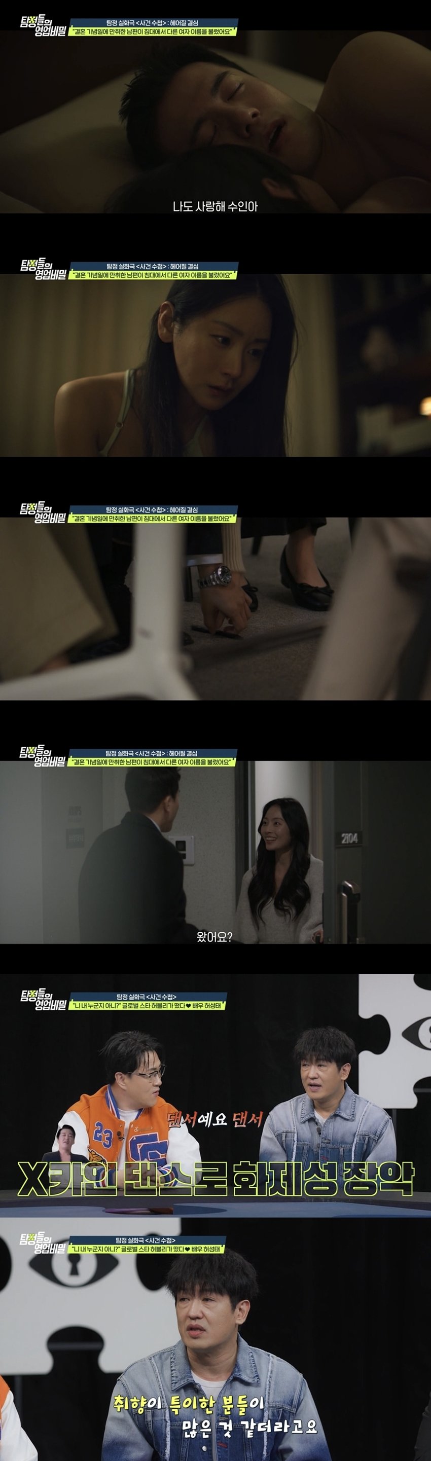 9일 오후 방송되는 채널A ‘탐정들의 영업비밀’ 속 ‘사건 수첩’에서는 “남편이 잠자리에서 다른 여자의 이름을 불렀다”는 한 여성의 사연이 등장한다. 결혼 기념일, 회사 일을 핑계로 만취해 들어온 의뢰인의 남편은 “수인아, 사랑해”라며 다른 여자의 이름을 부르고 사랑 고백까지 했다. 다음 날 의뢰인이 이를 따져 묻자 남편은 “술에 취해 기억이 나지 않는다. 잘못 들은 것 아니냐”며 대수롭지 않게 넘겼다. 그러나 의뢰인은 남편이 평소와 달리 친절한 말투로 메시지를 보냈다가 곧바로 삭제한 전적까지 떠올리며 외도를 의심했다. 더욱이 의뢰인은 “아이가 생겨 급하게 결혼하게 됐지만, 유산이 되면서 남편이 결혼을 후회하는 것은 아닌지 늘 불안에 떨었다”고 고백했다.