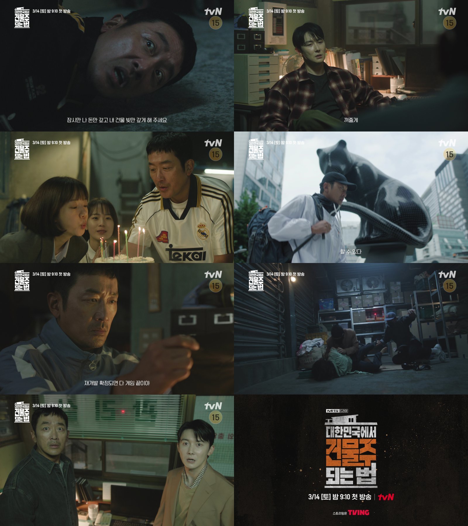 3월 14일 첫 방송되는 tvN 새 토일드라마 ‘대한민국에서 건물주 되는 법’(극본 오한기 연출 임필성, 약칭 ‘건물주’)은 빚에 허덕이는 생계형 건물주가 목숨보다 소중한 가족과 건물을 지키기 위해 가짜 납치극에 가담하며 벌어지는 서스펜스를 그린다. 하정우, 임수정, 김준한, 정수정, 심은경 등이 출연해 주목받는 작품이다.
