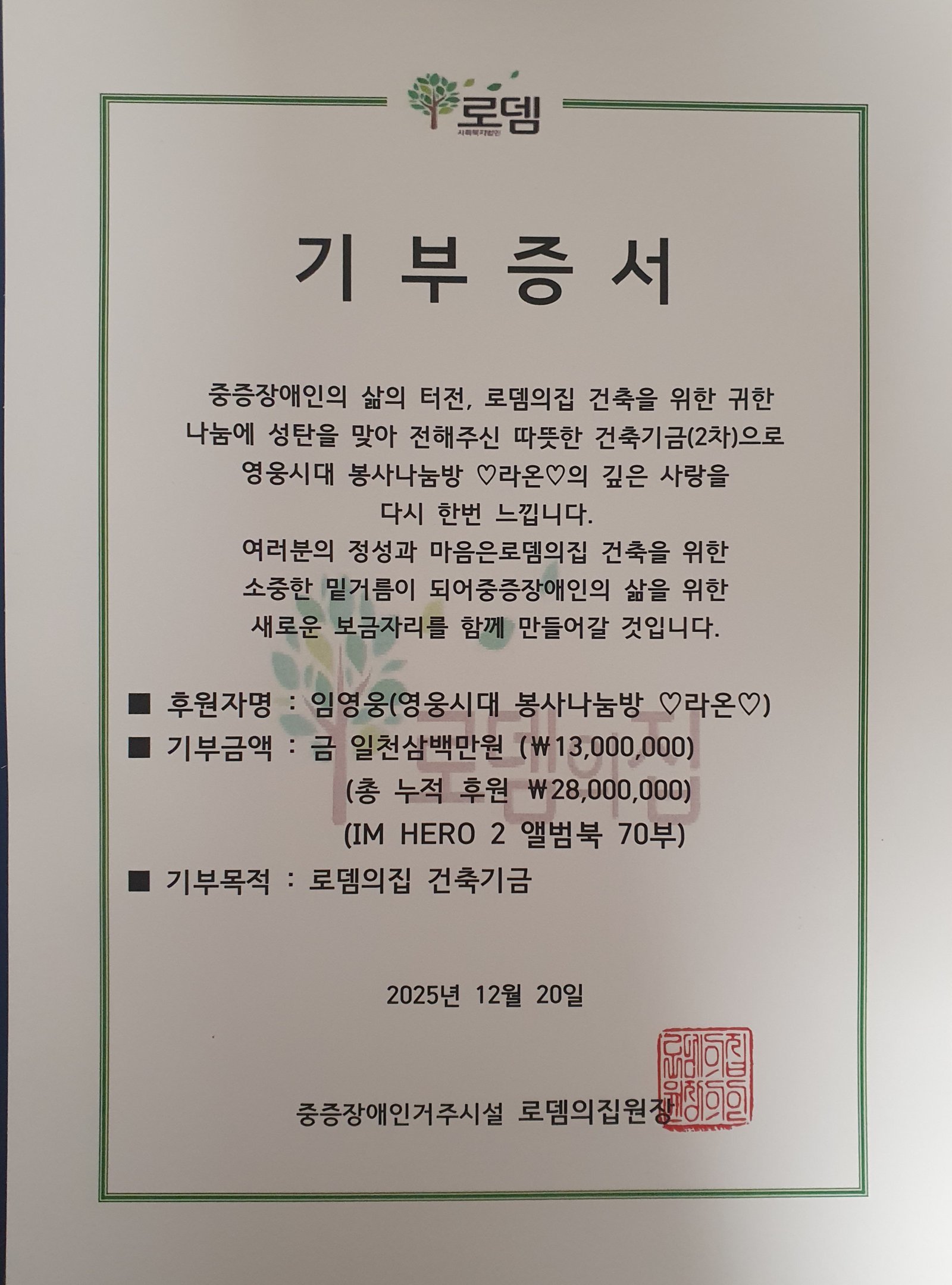 가수 임영웅 팬클럽 영웅시대 봉사나눔방 ‘라온’이 12월 20일 성탄절을 맞아 뜻깊은 기부를 진행했다. 기부처는 장애인 거주시설 ‘로뎀의집’으로, 재건축 기금 2차 후원금 1300만원과 임영웅의 ‘IM HERO 2’ 앨범북 70부를 함께 전달했다.