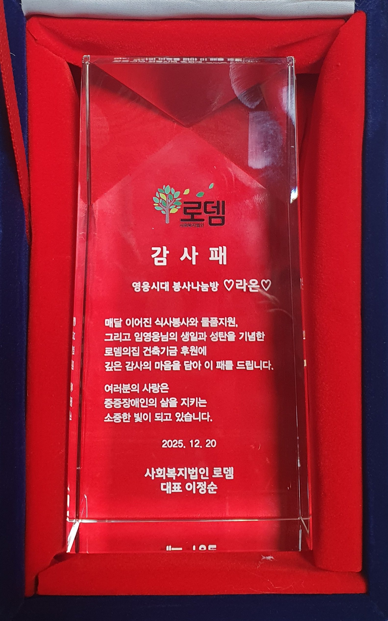 라온은 그동안 로뎀의집에서 매달 급식봉사를 이어오며 시설이 처한 현실을 가까이에서 지켜봐 왔다. 재건축 기금이 부족해 공사조차 시작하지 못하는 상황을 접한 뒤, 6월 임영웅의 생일을 기념한 1차 후원금 1500만원에 이어 성탄절을 계기로 다시 한 번 이곳을 위한 나눔을 결정했다.